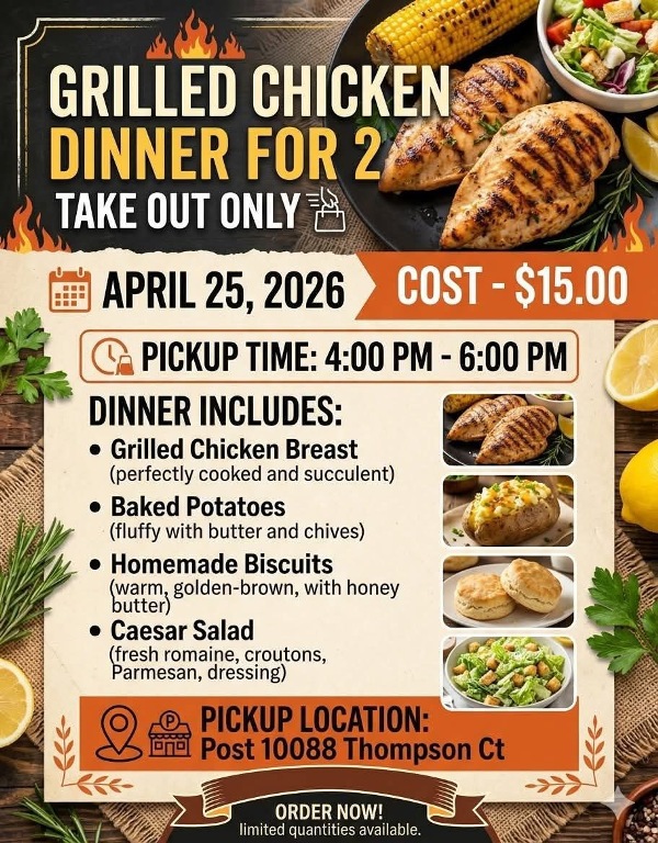 TICKETS ~ $15 ~ INCLUDES 1/2 CHICKEN, POTATO, SALAD, ROLL AND ICE CREAM